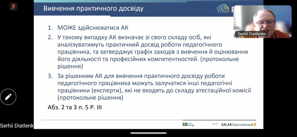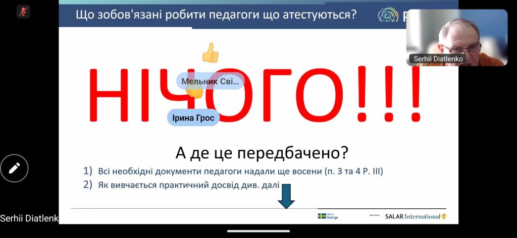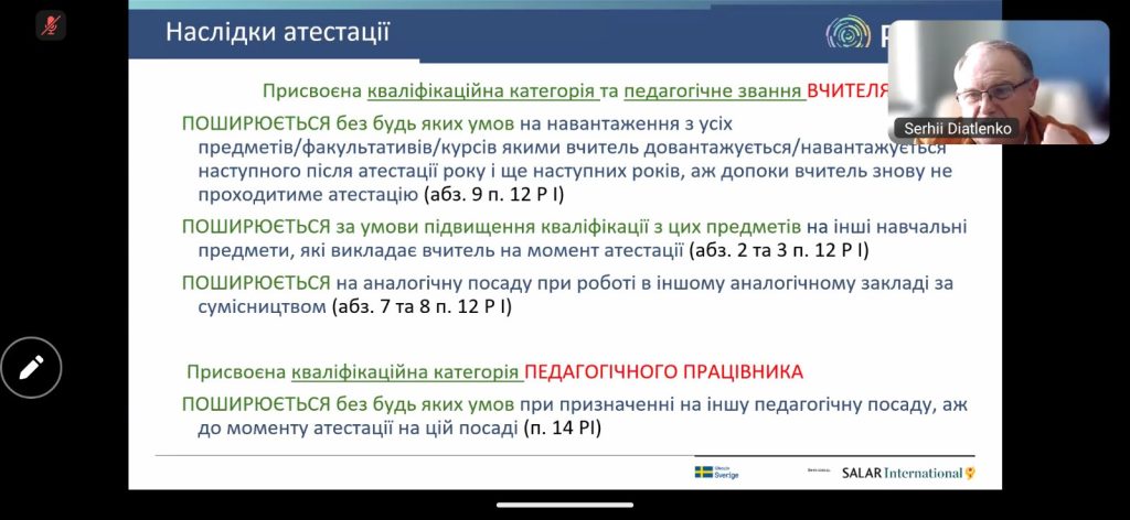 Спікером заходу виступив провідний експерт із питань освіти — Сергій Дятленко. Його практичні поради та роз’яснення нормативної бази завжди допомагають уникнути бюрократичних помилок та зосередитися на головному — об’єктивній оцінці професіоналізму вчителя.